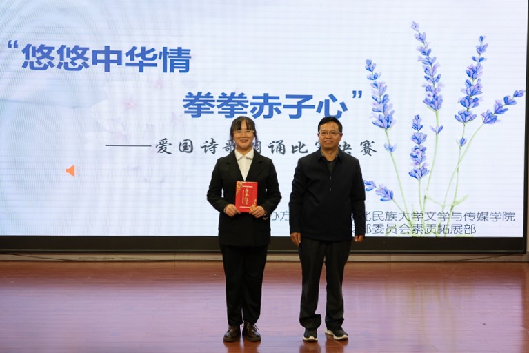 本网讯(记者 陆宇楠 陈雨捷 田忻)10月24日,文学与传媒学院在文传演播厅举办以“悠悠中华情,拳拳赤子心”为主题的爱国诗歌朗诵比赛决赛。文学与传媒学院老师徐定辉、郑泽红、范生范、毕曼应邀出席并担任评委。经过初赛的激烈角逐,共有十二组选手进入决赛。最终第九组文学与传媒学院学生刘清、吕鑫慧以96.625的高分摘得比赛桂冠。徐定辉为一等奖获得者颁奖(见习记者 陈雅欣/摄)第五组文学与传媒学院李紫阳、体育学院戴东明...