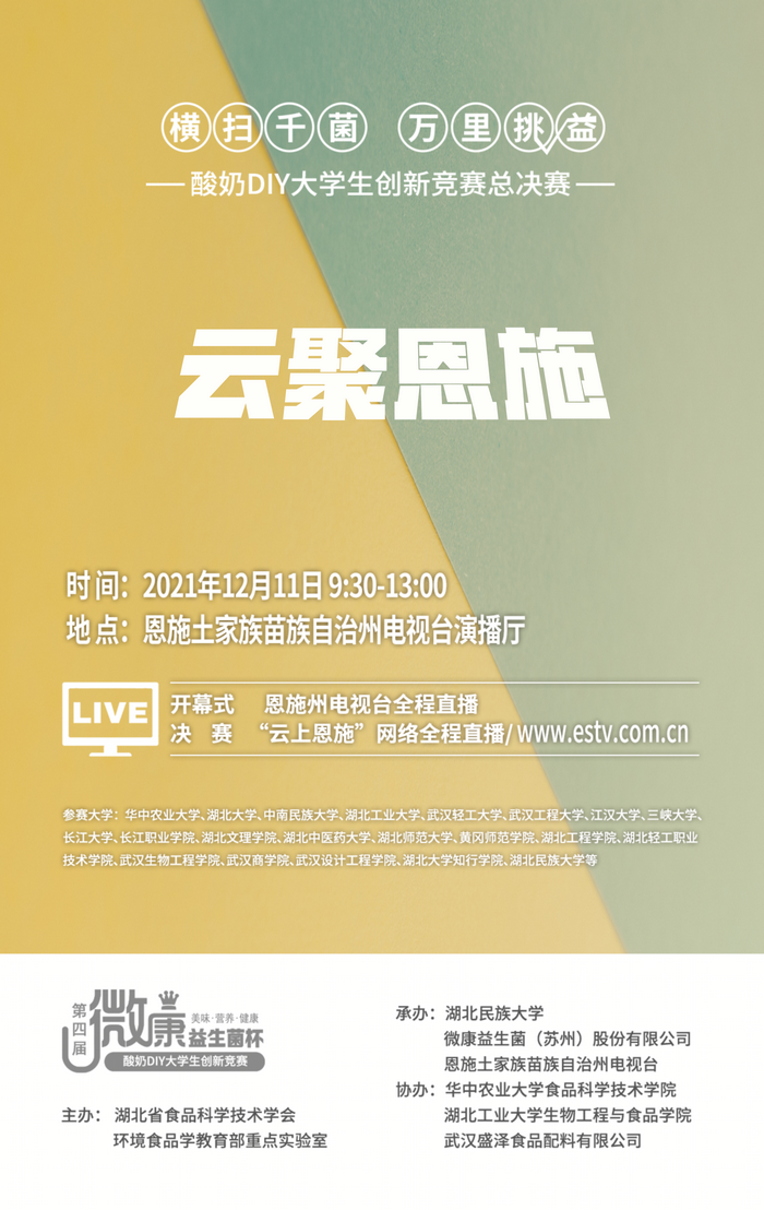 大赛海报由湖北省食品科学技术学会和环境食品学教育部重点实验室主办,永利官网承办的以“横扫千菌,万里挑益”为主题的酸奶DIY大学生创新竞赛总决赛,将于12月11日在恩施电视台演播厅举办,有包括永利官网、华中农业大学、湖北大学、中南民族大学等在内的20余所高校参赛。根据疫情防控要求,本次决赛采取团队代表线上答辩进行,届时,开幕式由恩施州电视台进行现场电视直播,同步“云上恩施”网络直播,决赛全程通过“云上恩施”网络直...