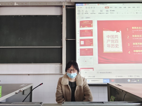 授课伊始,张艺馨指明党的百年历程是用鲜血、汗水、泪水、勇气、智慧、力量谱写而来,接着以“中国共产党百年辉煌”为主题,从开天辟地、改天换地、翻天覆地、惊天动地、宝贵经验五个方面为切入点进行授课,并通过观看《觉醒年代》回顾中国共产党的奋战历史,以此带领与会成员探索中国的社会主义道路建设。她阐述了从新民主主义革命时期到现今我国所面对的挑战及应对方案,在这个过程中,我国发生了惊天动地的变化,国家从封建专制走向中国特色社会主义道路,中国人民从站起来到富起来、强起来等等,无一不凸显我国社会主义制度的优越性,中国共产党领导的正确性。随后,在带领大家学习党的十九大精神时,她谈到中国共产党一直坚持以人民为中心,除了工人阶级和最广大人民群众的利益外,没有自己的利益,更没有自己的特殊利益。而后,她用十三个“必须”总结了中国共产党的百年历史,并指出我们要学会借鉴历史、总结历史、勇于进行“自我革命、自我净化、自我完善、自我革新、自我提高能力”保持党的“先进性、纯洁性”。最后,通过观看新中国成立70周年的视频,她希望与会成员能牢记初心,不忘使命,永远奋斗,未来在中国共产党的带领下创造更加辉煌的历史。