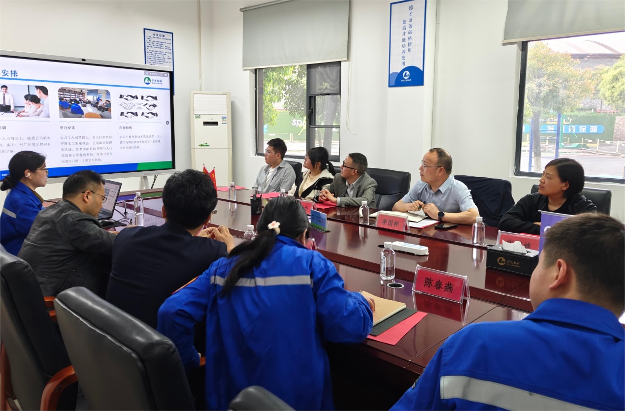 在南漳龙蟒磷制品有限责任公司洽谈现场,首先由公司介绍了我院十名学生的实习工作情况,院长李国祥等就实习收获、考研情况、就业意愿等方面与同学们进行了深入座谈。随后双方就校企共建的校级研究生工作站进行了合作启动仪式并就后续新工科人才联合培养进行了工作对接。最后,李国祥一行在公司负责人朱洪成的带领下参观了公司的发展历程展览大厅、企业团建场所和厂房设施。