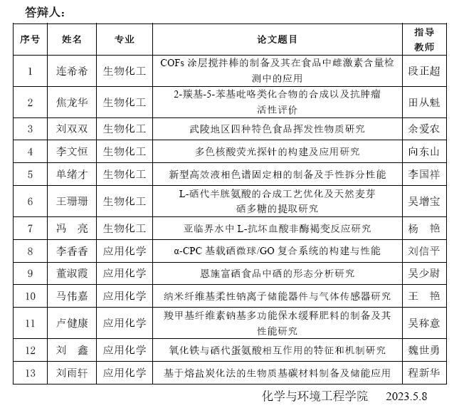 3044am永利集团3044noc化学与环境工程学院2023届硕士研究生学位论文答辩公告(2)