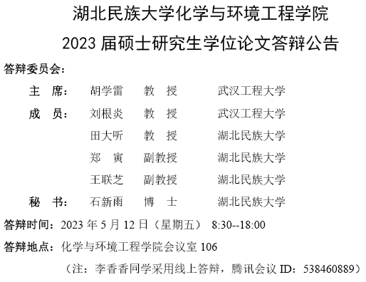3044am永利集团3044noc化学与环境工程学院2023届硕士研究生学位论文答辩公告(1)