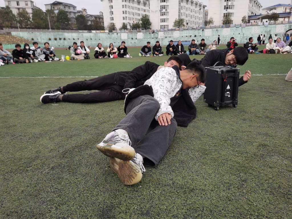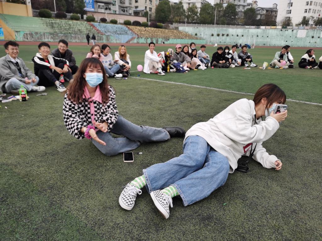 此次活动分为四个部分,小组赛“水杯接力”、随机奖励惩罚“要不要挑战”、大团体赛“123木头人”和“踩气球”。其中,“要不要挑战”最具有看点,在纸箱中随机抽取纸条,上面写有各种奖励和惩罚,不要就下场,要就根据纸条上的内容作出反应。最热烈的活动是“踩气球”,两人一组并将一条腿绑在一起,另一只脚绑气球,一组分为十小组,互相踩气球,最后哪个小组剩余气球最多即为获胜。最后,此次朋辈活动在欢声笑语中结束。