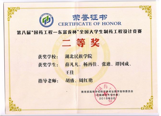 工作期间,胡盛老师积极指导学生参加各类创新创业学科专业竞赛,指导学生获批创新项目8项,其中省级1项;指导学生获得全国制药工程设计比赛大赛二等奖1项、三等奖4项,全国医药院实验技能竞赛三等奖2项。“打铁还需自身硬”,他还积极参加各类业务比赛,不断提高自身教学实践业务水平,2022年获得湖北省第八届高校青年教师教学竞赛工科组优秀奖和学校教师教学创新大赛三等奖。