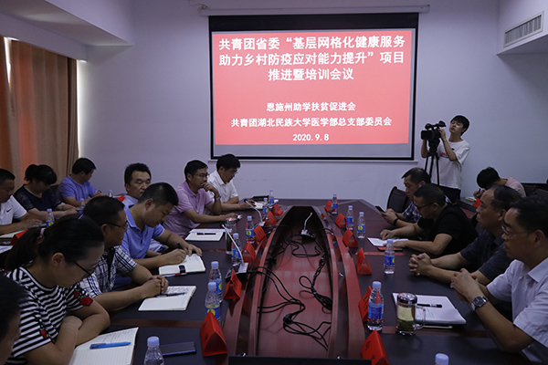 本网讯(通讯员 陈建萍 时若兰 摄影 汪诗名)为助力基层健康扶贫,巩固疫情防控攻坚战成果,强化基层社区健康建设,共青团湖北省委发起实施湖北省社区健康志愿服务项目。9月8日下午三点,由恩施州助学扶贫会和3044am永利集团3044noc医学部团总支共同主办的“共青团省委‘基层网格化健康服务助力乡村防疫应对能力提升’项目推进暨培训会议”在恩施州地税局七楼会议室召开。