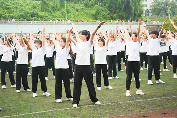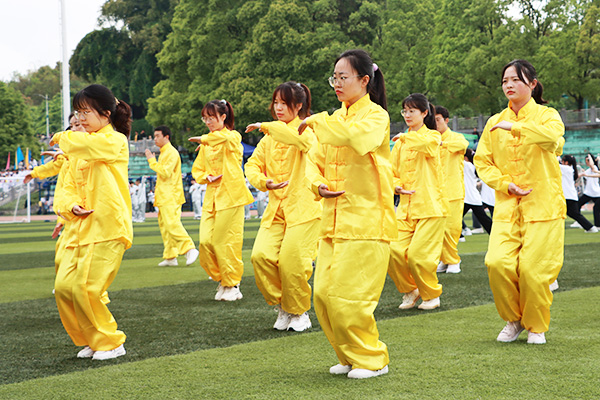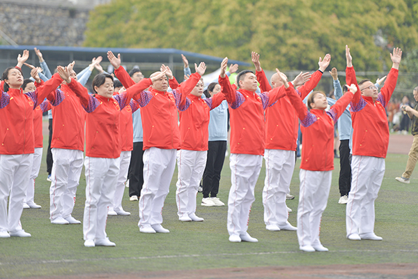 阳光普照大地,万物充满生机。开幕式后,太极拳和师生广播体操比赛正有序进行。