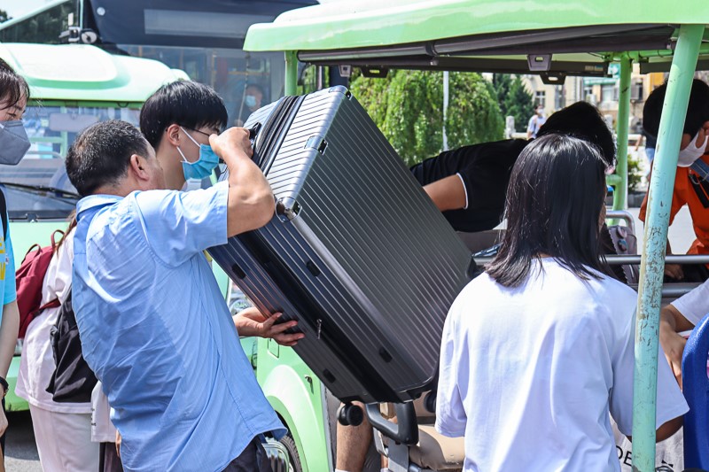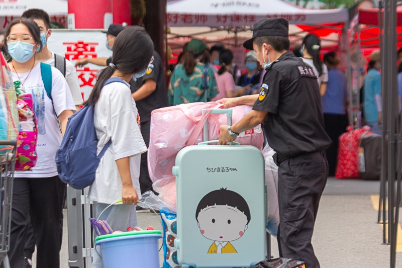 保卫处工作人员帮新生搬运行李(记者 李经玺/摄)