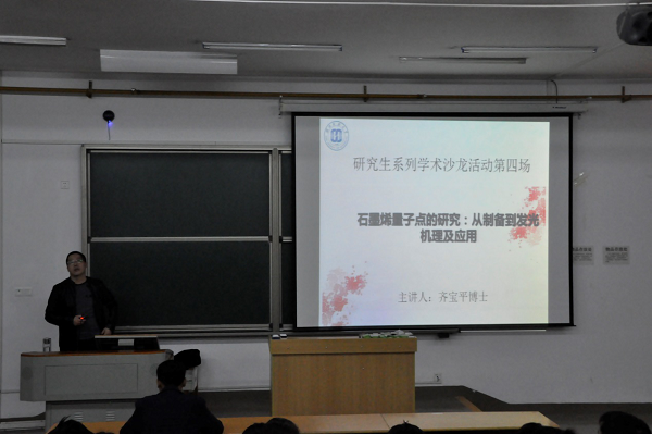 齐宝平与学生一起探讨石墨烯量子点的独特性和在生活中的广泛应用,重点介绍了其在可控设备、发射光谱调控及其在生物传感构建方面的应用,并对在医学、能源、电子器件等领域的应用做出了展望。