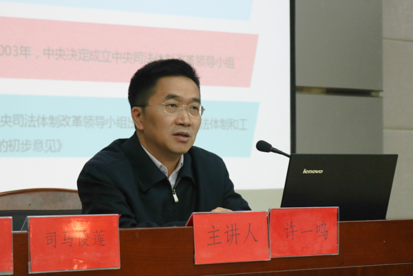 许一鸣围绕“中国司法体制改革进程回顾”“新一轮司法体制改革的主要内容与特点”“恩施州司法体制改革的基本情况”三方面展开讲座。