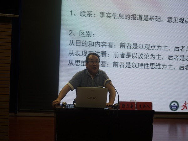 讲座伊始,强月新教授提出“观点记者”这一名词,并从“什么是观点记者”、“时代如何呼唤观点记者”、“怎么做好一名观点记者”三方面一一展开讲解。 强月新教授首先对“观点记者”进行解释,即以发表意见和观点为主的记者就称之为观点记者。再由此出发,从目的和内容、表现手法、观思维方式三个不同层面上比较“观点记者”与“一般记者”,前者以观点、议论、理性思维为主;而后者以事实、叙述、感性思维为主。最后强教授概括道:“观点记者与一般记者的区别就好比焦点访谈记者与新闻联播记者的不同”。