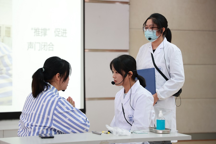 大三组各队分别从病例分析、康复功能评定及诊断、康复方案、康复治疗目标及健康宣教等五个方面,以临床案例模拟方式进行康复治疗专业技能展示。参赛选手沉着冷静、操作规范、技巧娴熟、团结协作,展现出扎实的理论基础及高超的实践技能水平。在案例模仿治疗中,康复治疗师对患者的治疗服务良好、耐心温柔、态度友善,充分展现出对患者的人文关怀。