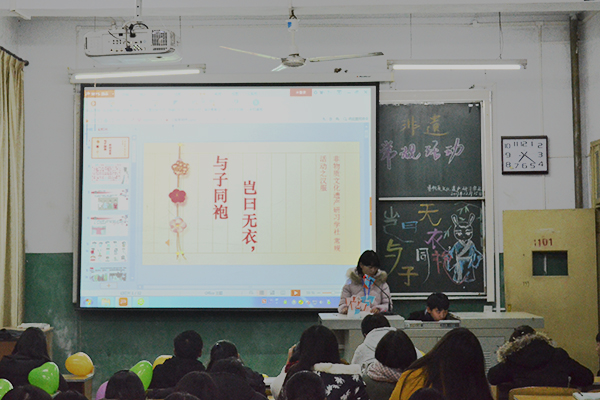活动伊始,该社成员以“长裾连理带,广袖合欢舞”“越罗衫袂迎春风,玉刻麒麟腰带红”作引,为在场学生简单介绍汉服知识。她介绍,汉服由中衣、曲裾等部分组成,具有独特的美学内涵与人文价值,也使中国作为“衣冠上国”“礼仪之邦”“锦绣中华”“赛里斯国”有迹可循。随后,工作人员深入浅出地解释本次活动主题“岂曰无衣,与子同袍”的内在意义,指出“同袍”是所有汉服爱好者共同的归属感。