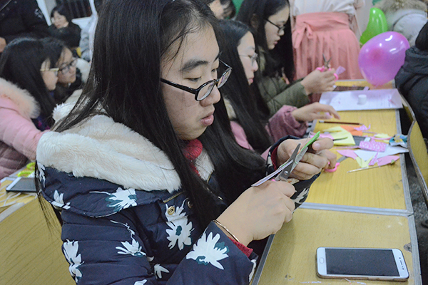 学生体验“纸折汉服”