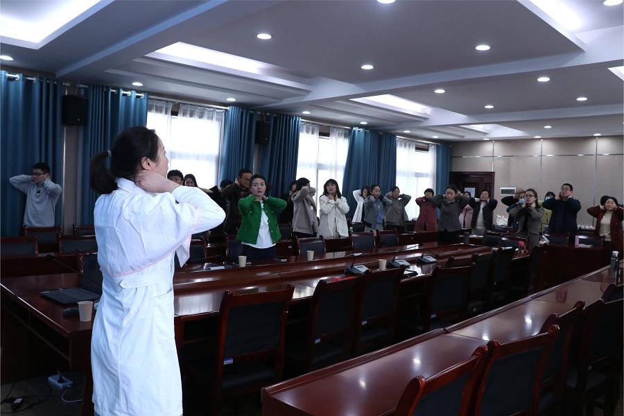 郭成焰带领全体教师做预防脑卒中的健身操。