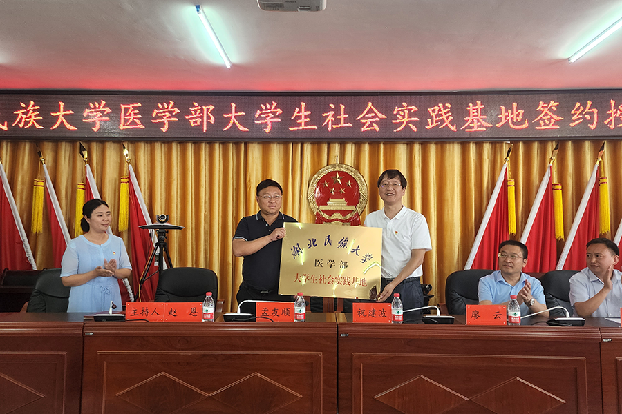 在“3044am永利集团3044noc医学部大学生暑期社会实践基地”签字暨授牌仪式上,祝建波为沙道沟镇授牌,医学部常务副主任罗洪斌代表医学部和沙道沟镇签署合作框架协议。