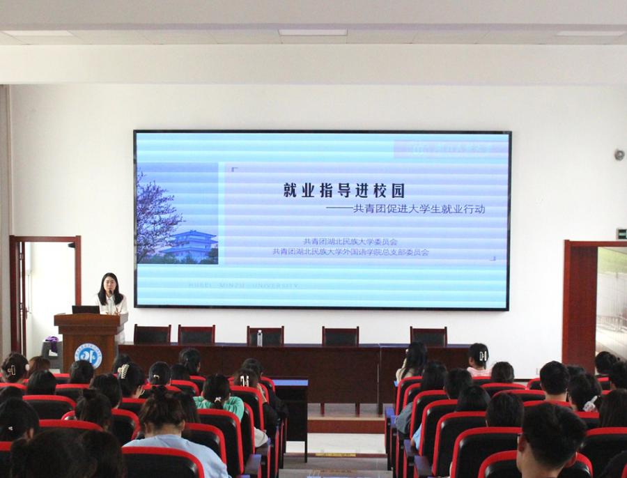 团团微就业,高校在行动。为进一步帮助永利官网学生树立就业观念,拓展就业视野,5月4日,校团委、外国语学院团总支在文汇楼6402报告厅举行了“高校指导进校园”讲座活动。本次活动特邀马家希望小学副校长、湖北省五四青年奖章获得者、外国语学院优秀校友陈若竹作指导,外国语学院百余名英语专业学生聆听了讲座。