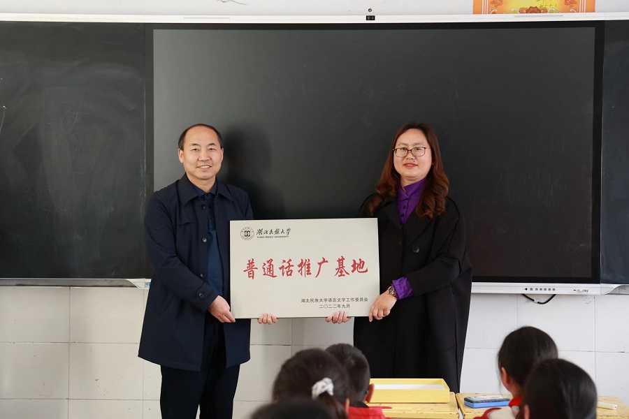 党委常委、副校长李军(左一)为普通话推广基地授牌