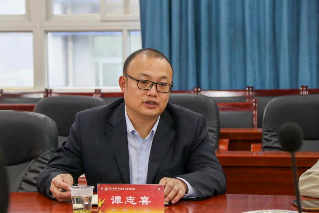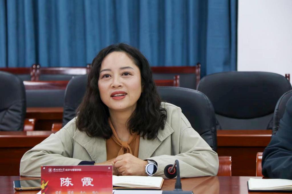 陈霞讲话。她从学院的办学历程、在校师生人数、专业分布情况以及科研成果等方面对经济管理学院的基本情况进行介绍。她表示,经济与管理学院具有悠久的办学历程,未来将继续在人才培养、科学研究、促进地方经济社会发展以及文化传承等方面为社会贡献力量。