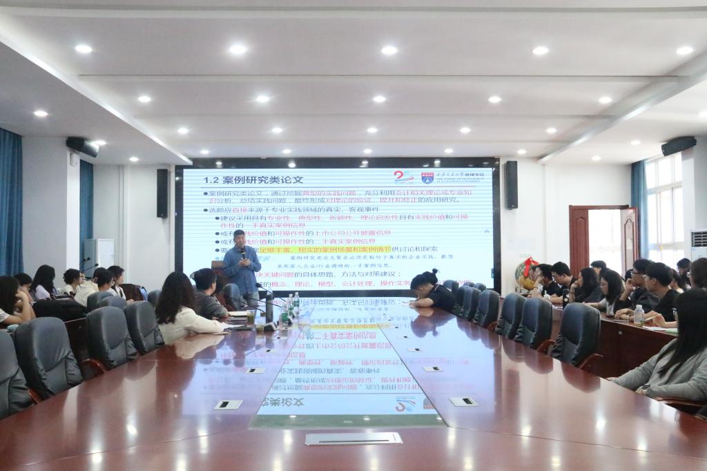 本网讯(记者 段由燕/文 郑诗彤/图)2025年5月11日,经济与管理学院“MPAcc论文基本要求与目标定位”专题讲座在经管楼附303会议室举行。西安交通大学管理学院会计与财务系主任、教授、博士生导师、全国会计专业学位研究生教育指导委员会委员汪方军受邀担任主讲人,经济与管理学院MPAcc教育中心主任游宇及部分研究生参与本次讲座。经济与管理学院党委书记陈霞担任讲座主持人。