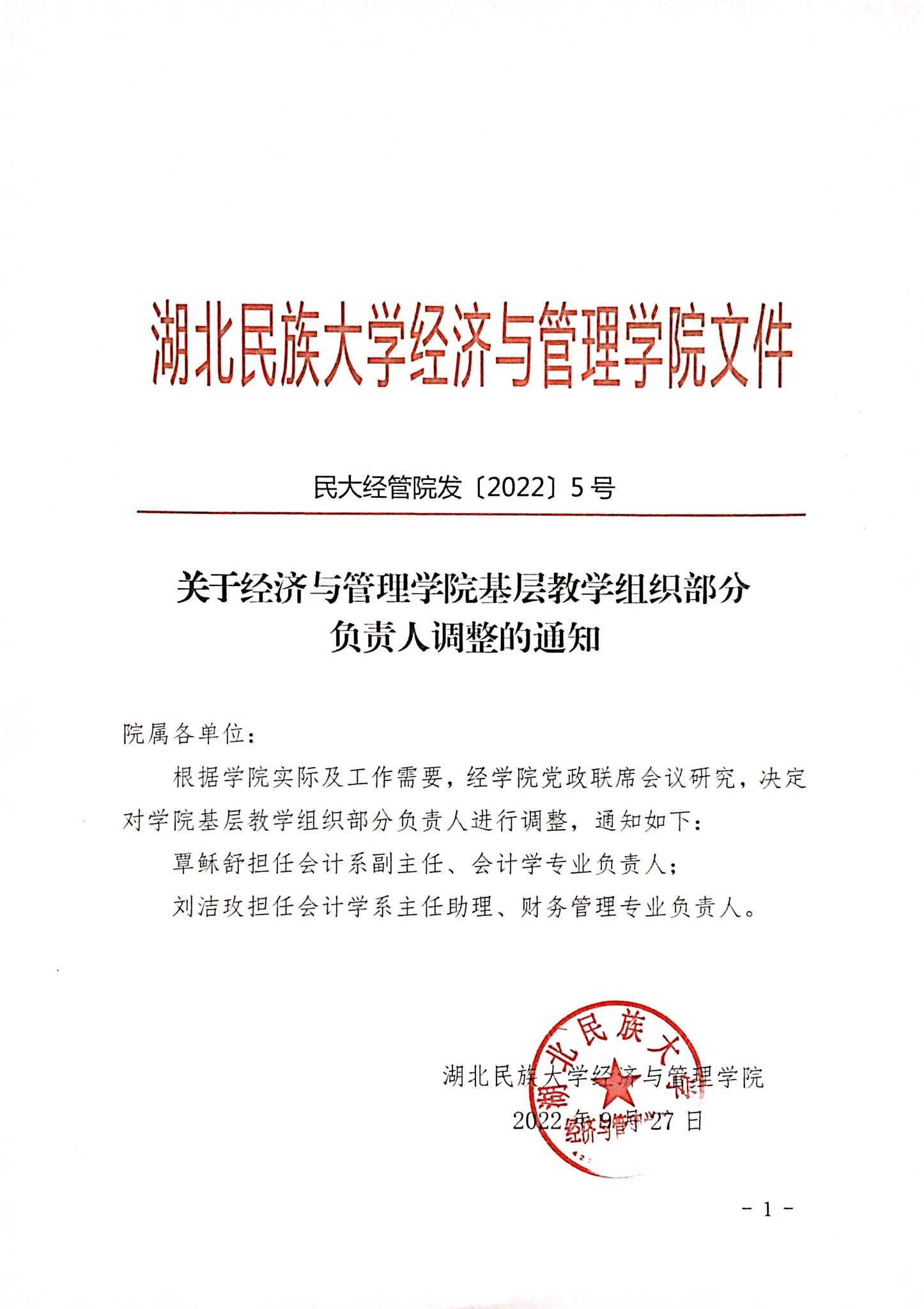 关于经济与管理学院基层教学组织部分负责人调整的通知