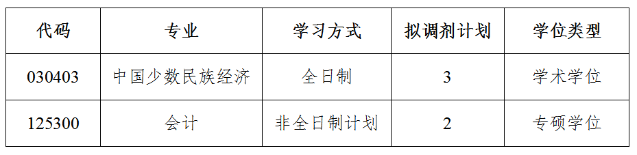 我院接收调剂的中国少数民族经济专业、会计专硕及生源缺额信息在“全国硕士生招生调剂服务系统”中公布,调剂系统开放时间为:2023年4月10日12:00-4月11日08:30,视报名情况适当调整。调剂复试日程安排请关注学院官网上关于调剂的通知。