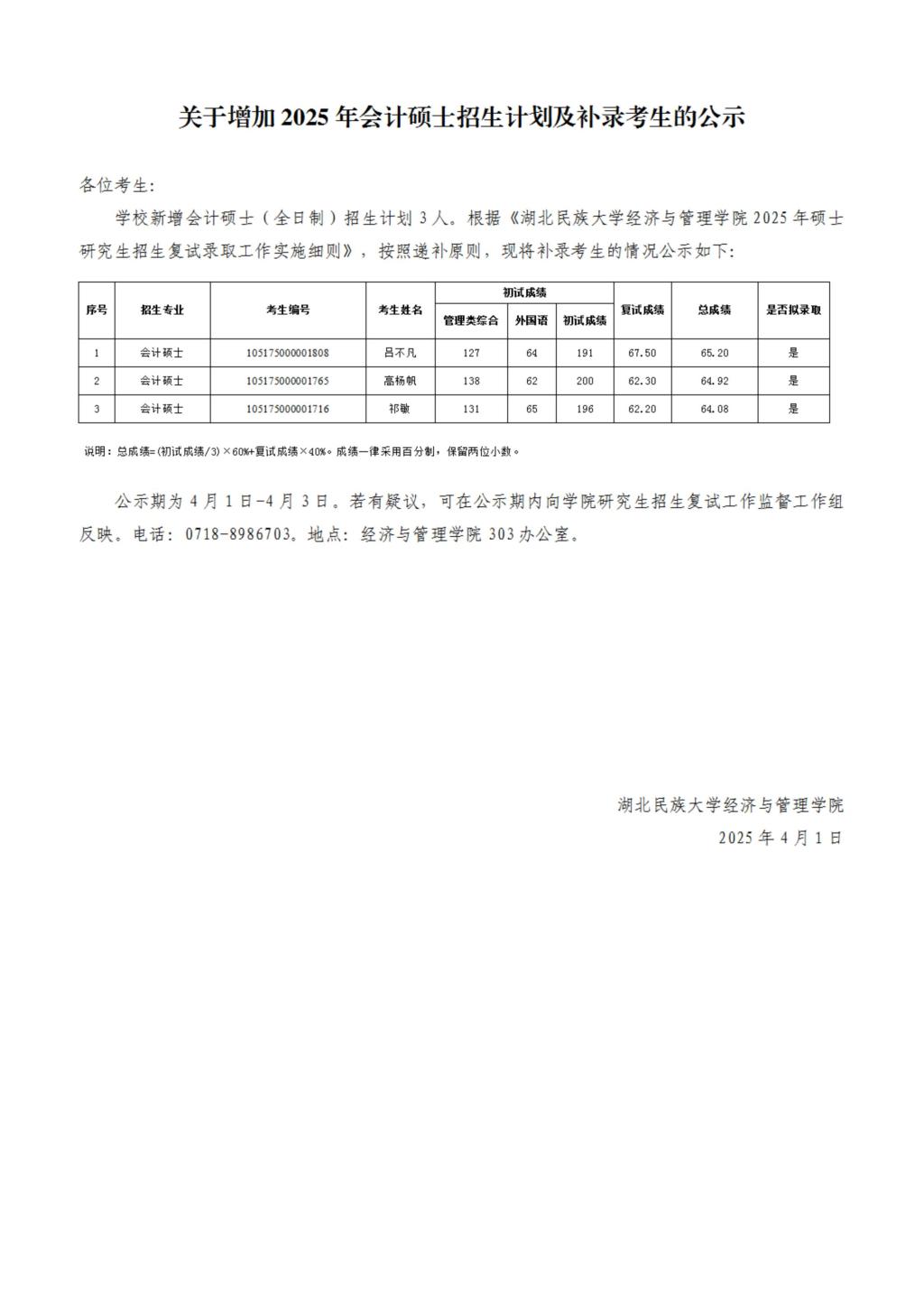 关于增加2025年会计硕士招生计划及补录考生的公示