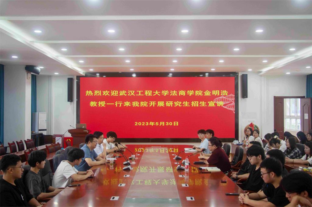 本网讯(记者 穆语恒 尚仁毅/文 杨欣然 周隆宇/图)2023年5月30日,武汉工程大学法商学院(知识产权学院)金明浩教授一行到经济与管理学院经管楼附303会议室开展研究生招生宣传。武汉工程大学法商学院(知识产权学院)院长金明浩、院长助理、副教授代江龙,经济与管理学院院长张新平、法学院副院长蔡世鄂等应邀出席宣讲会。经济与管理学院与法学院部分学生参加了本次宣讲会。