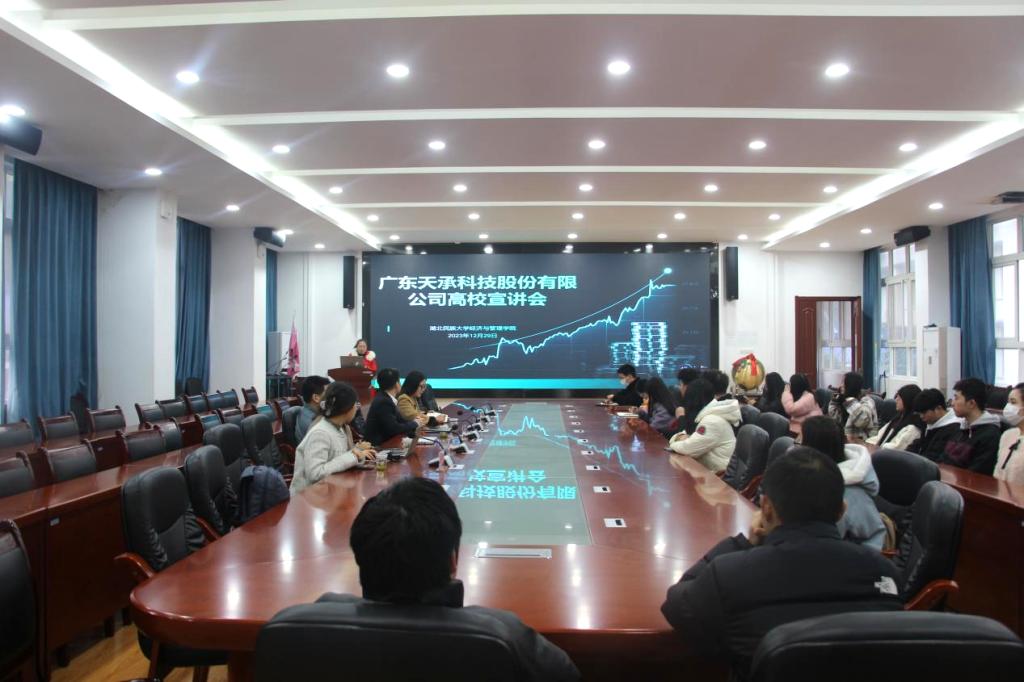 本网讯(见习记者 陈琪睿 蔡甜甜/文 郑诗彤 方坤/图)为拓宽毕业生就业渠道,搭建校企合作桥梁,助力学生高质量就业,2023年12月29日,经济与管理学院举办的广东天承科技股份有限公司校园招聘宣讲会在文瀚楼附303会议室隆重举行。广东天承科技股份有限公司研发部总监章晓冬、市场部总监侯仁祥人事行政经理童秀、人事专员阮文璐、经济与管理学院党委副书记张姣蓉、学生科辅导员解丽娟、覃雨、唐桢坤及2024届毕业生参加本次宣讲会,会议采取线上线下相结合方式进行。