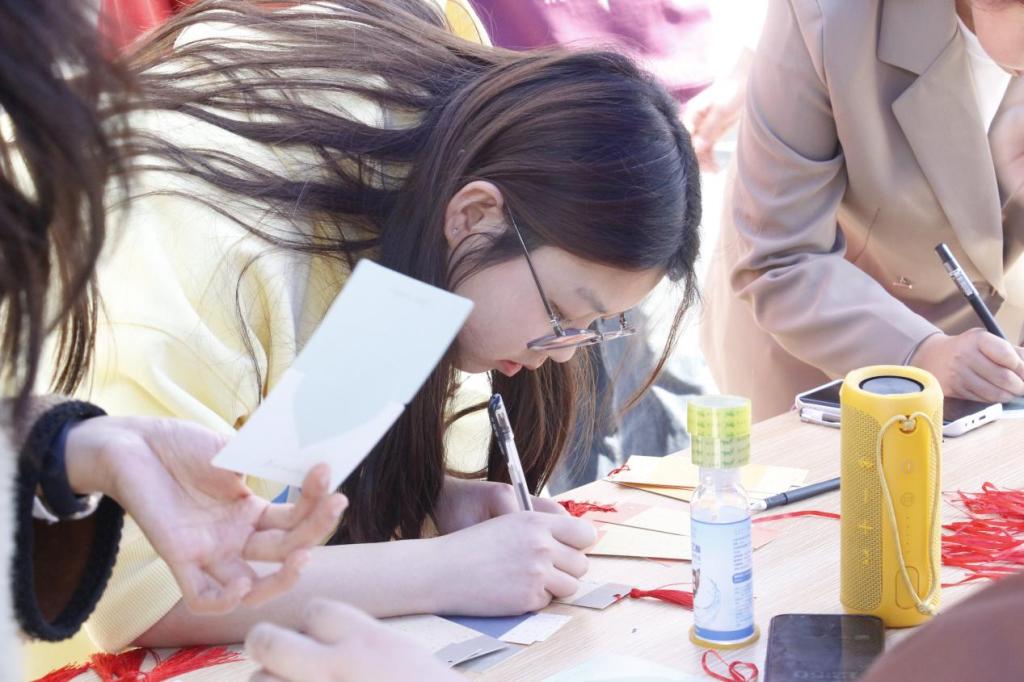 活动前期通过多种方式扩大宣传,动员学生踊跃报名,提高学生参与度。活动期间,学生在祈福卡上写下对老师和亲友祝福并挂在留言板上。在抽卡环节,学生在抽奖箱中抽出奖品并进行兑换;在插花环节,学生根据个人抽取的奖次进行插花。