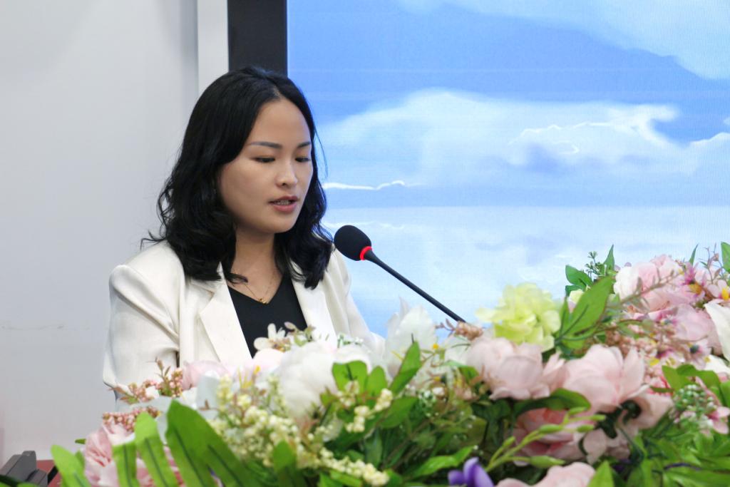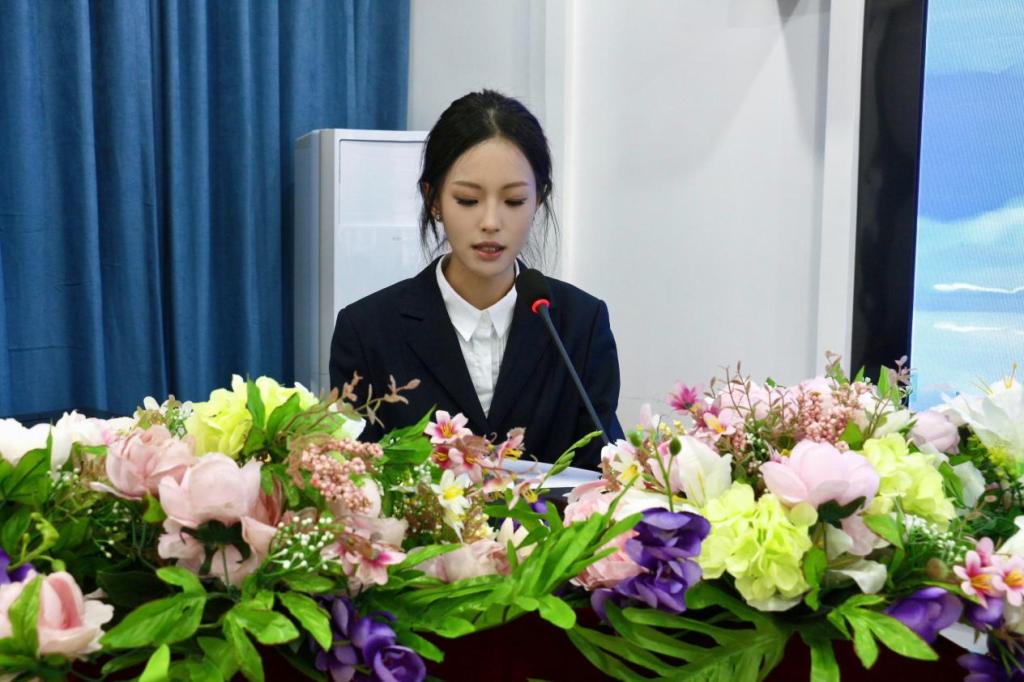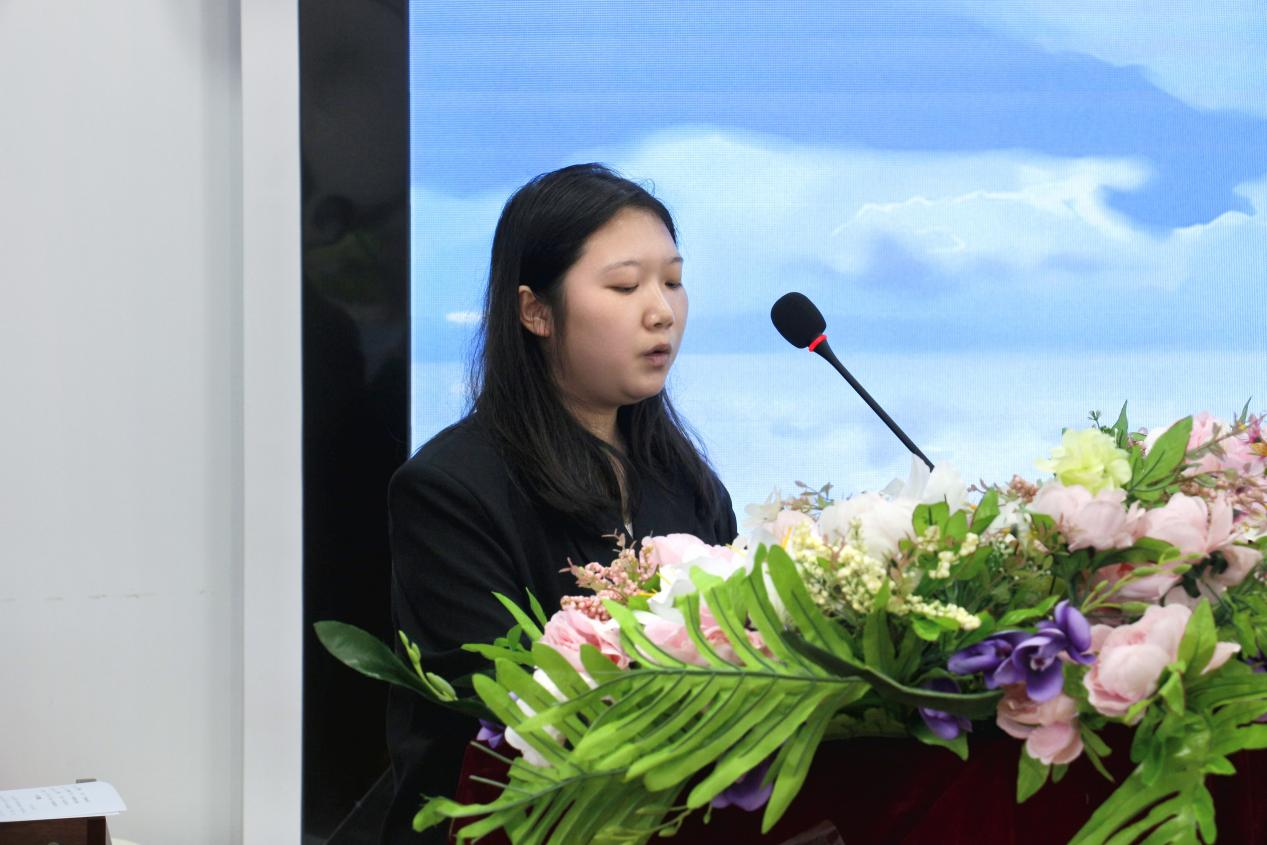 团总支代表舒紫红发言。她首先感谢上一届学生干部的付出,并希望组织成员能以严格的标准和严谨的态度砥砺自我,不忘初心、踏实笃行,用饱满的热情和切实的行动建设更有温度、更有力量的团总支。
