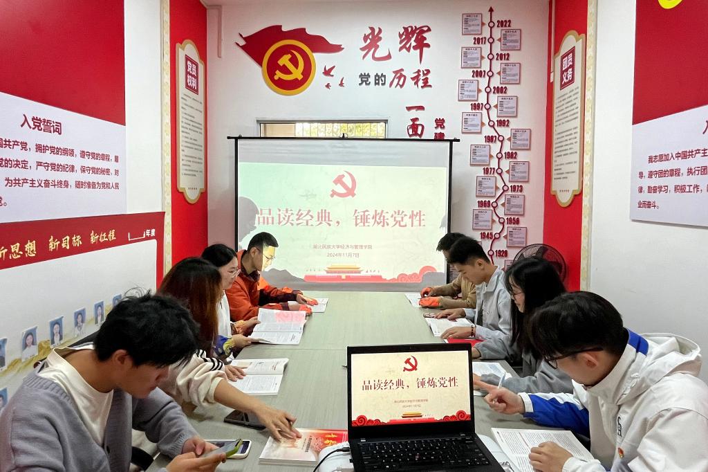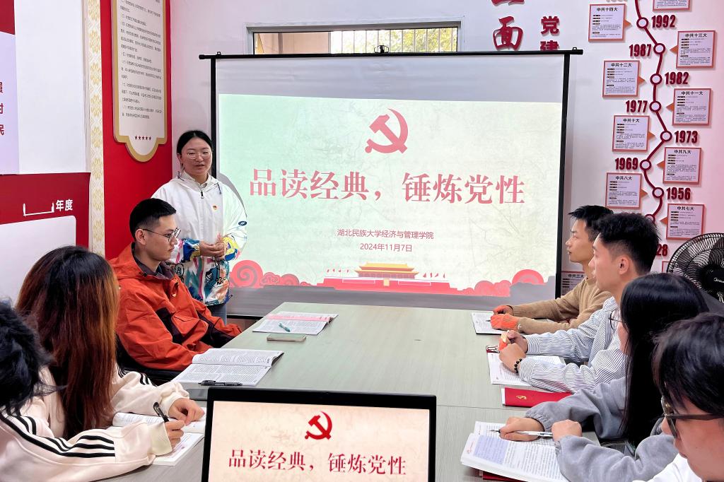本网讯(记者 黄国轩/文 覃雨/图)为加强学习型党组织建设,倡导学生党员自觉养成爱读书、读好书、善读书的好习惯,从书籍中汲取知识、充盈智慧,进一步提升综合素养,2024年11月7日,经济与管理学院学生党支部在“一站式”学生社区-春雨社区开展“品读经典,锤炼党性”读书分享会。