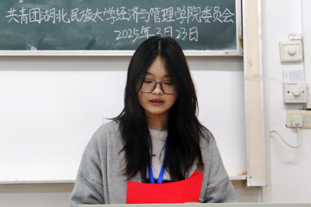 24级学生代表聂钰发言。她表示,追光是朝着心中目标笃定前行,沐光是持续从榜样身上获取奋进力量。她呼吁经管学子以追光的执着完成每一项挑战,以沐光的姿态学习他人之长,以青春的激情与智慧在经济与管理领域发光发热,向着光明未来奋勇前行。