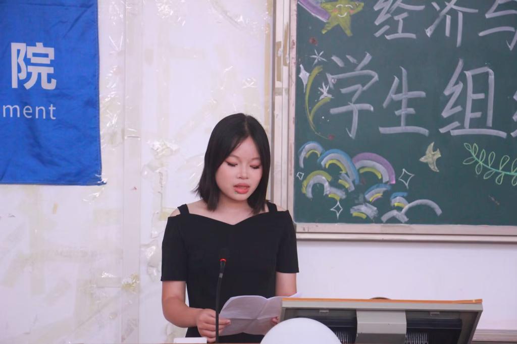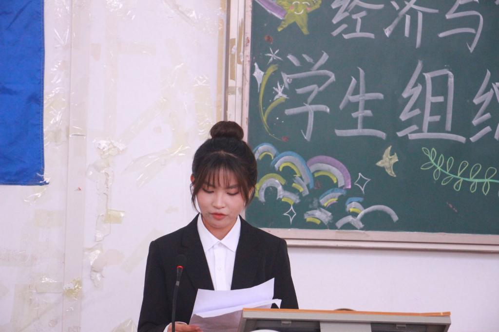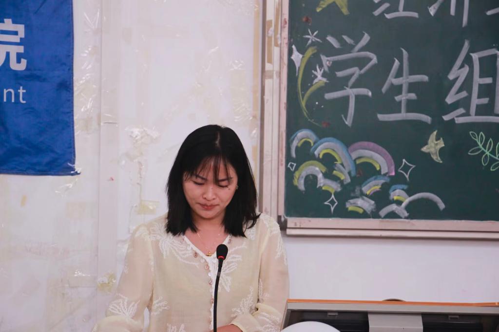 学生会代表张甜发言。她通过对自身过去工作经历的回顾与反思,呼吁新一届学生会成员传承责任担当,坚定理想信念,在工作中积极面对困难、勇敢迎接挑战,以务实行动丰富学生校园活动。