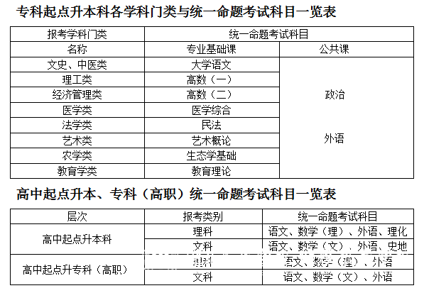 七、高等学历继续教育入学考试科目