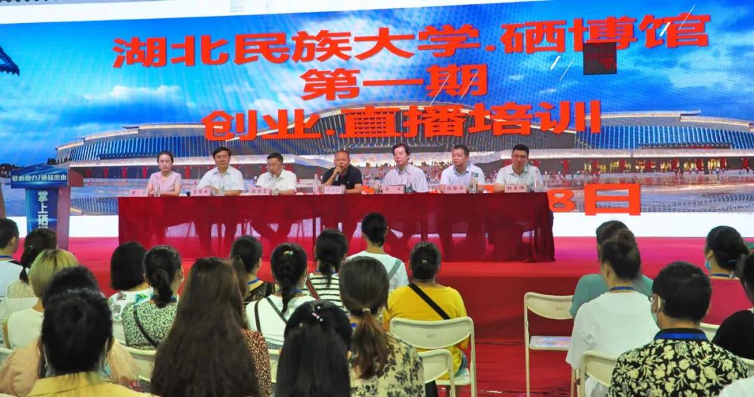7月28日,在州人力资源和社会保障局、州硒资源保护与开发中心、州公共就业和人才服务局的指导下,由永利官网和州文化中心硒博馆共同举办的第一期“千星万红”创业·直播带货培训开班典礼在硒博馆顺利举行。3044am永利集团3044noc继续教育学院院长雷随斌,恩施聚硒商业管理有限公司董事长周才红、总经理张国富,人社部国家级项目培训导师陈平、陈徐平、杨复伟和来自恩施各县市的120余名培训学员出席开班典礼。