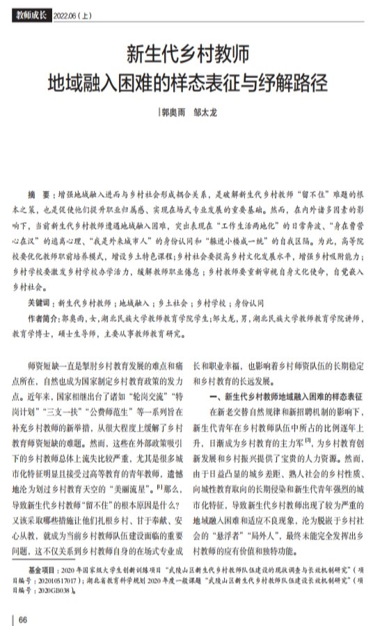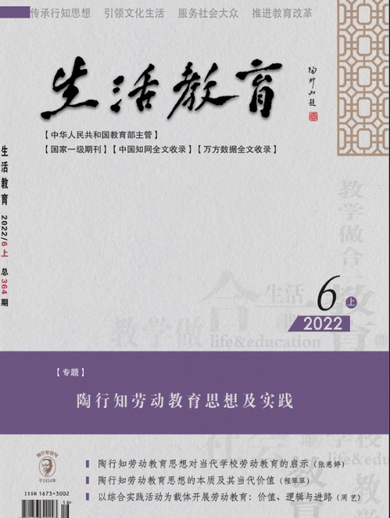 我院邹太龙博士指导大三学生郭奥雨同学的一作论文《新生代乡村教师地域融入困难的样态表征与纾解路径》,被刊载于陶行知先生题名的《生活教育》2022年第6期。该文系2020年国家级大学生创新训练项目“武陵山区新生代乡村教师队伍建设的现状调查与长效机制研究”(编号:202010517017)研究成果。