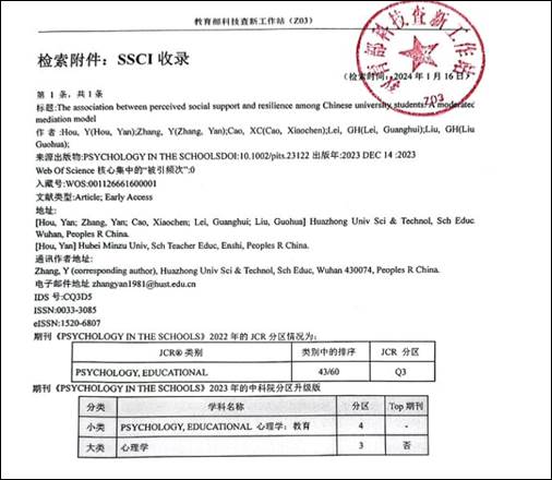 我院教师、华中科技大学在读博士生侯燕的论文《The association between perceived social support and resilience among Chinese university students: A moderated mediation model》(第一作者)发表在《Psychology in the Schools》(IF=1.8,SSCIQ3)。
