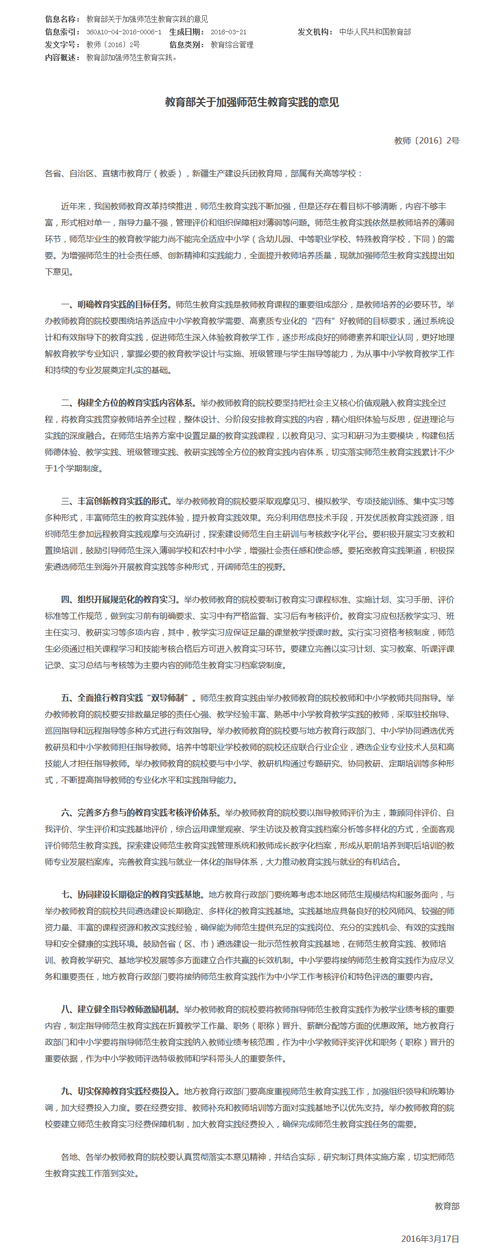 教育部关于加强师范生教育实践的意见