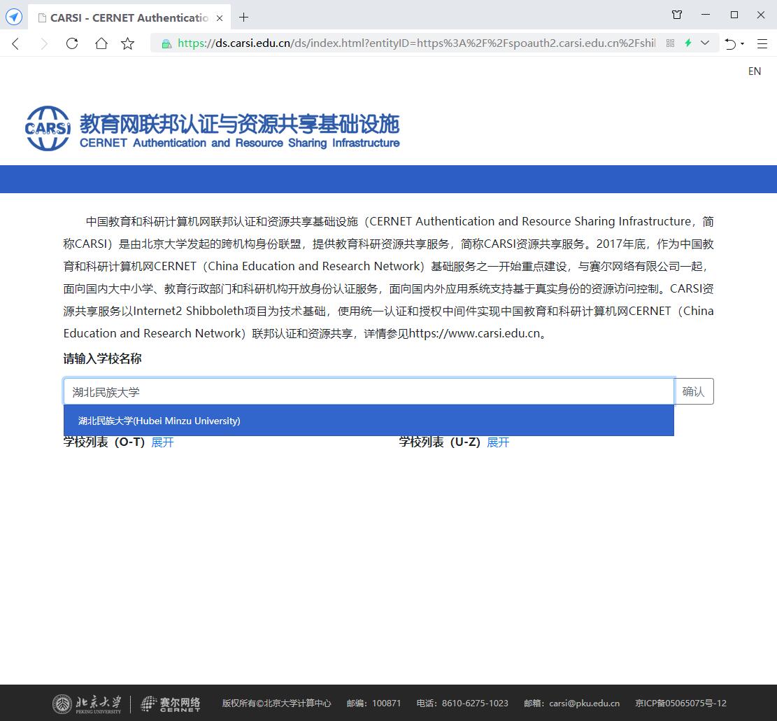 2、进入CARSI机构联盟学校页面,选择所在学校,3044am永利集团3044noc。