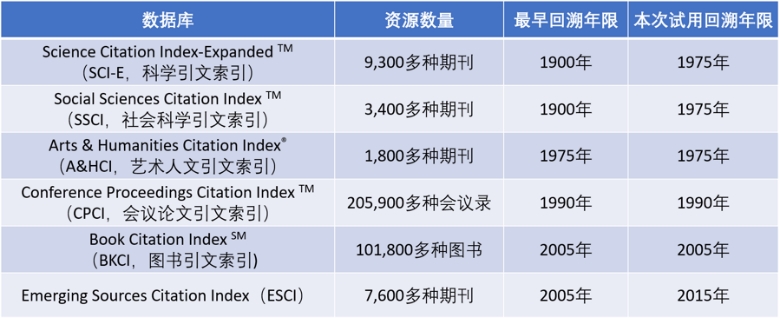 Web of Science核心合集的构成、资源数量及其回溯深度: