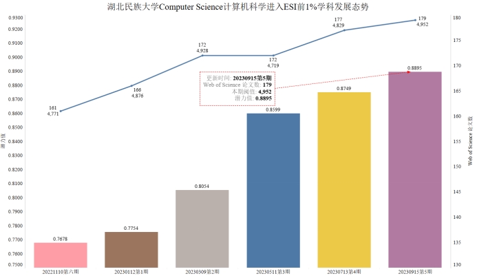 本期永利官网有望进入ESI前1%的学科为Computer Science 计算机科学,潜力值为0.8895,论文数179,引用量4405,本期入围阈值为4952。