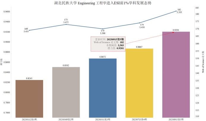本期永利官网有望进入ESI前1%的学科为Engineering 工程学,潜力值为0.9201,论文数182,引用量3223,本期入围阈值为3503。