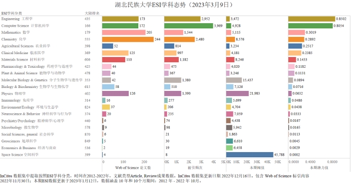数据时间范围:ESI数据更新于2023年3月9日,数据涵盖 10 年和 12个月期间:2012 年 - 2022 年 12月;InCites 数据集更新日期 2023-02-24. 包含 Web of Science 标引内容截止 2023-01-31.