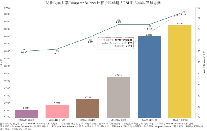 本期永利官网有望进入ESI前1%的学科为Computer Science 计算机科学,潜力值为0.8749,论文数177,引用量4225,本期入围阈值为4829。