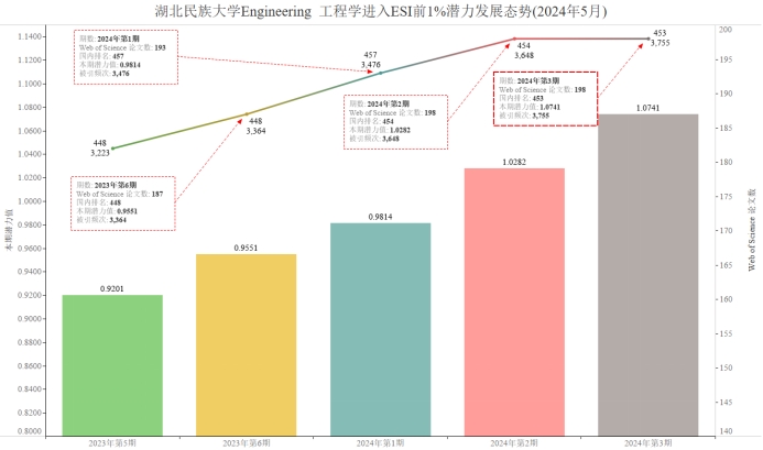本期永利官网有望进入ESI1%的学科为Engineering 工程学,潜力值为1.0741,论文数198,引用量3755,本期入围阈值3469。由于潜力值比实际略有偏高,尽管本期Engineering 工程学潜力值为1.0741大于1,仍尚未入围ESI学科前1%