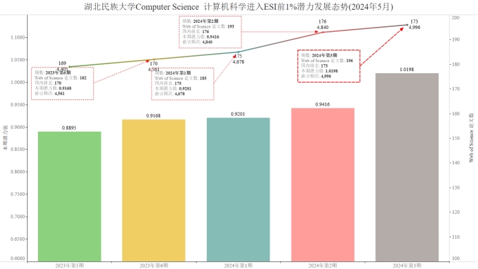 本期永利官网有望进入ESI1%的学科为Computer Science 计算机科学,潜力值为1.0198,论文数196,引用量4996,本期入围阈值4899。由于潜力值比实际略有偏高,尽管本期Computer Science 计算机科学潜力值为1.0198大于1,仍尚未入围ESI学科前1%