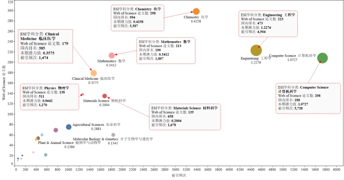 表2为本期永利官网ESI分类各学科态势情况,发文量、被引频次与潜力值的分布,球越大表明潜力值越高,当中Engineering工程学已经入围,潜力值最高的为计算机科学。