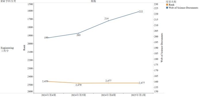 根据基本科学指标数据库(Essential Science Indicators,简称ESI)2025年1月9发布的最新数据显示(2025年1月9日更新,数据涵盖10年10个月:2014年 - 2024 年10月),本期共有9717家研究机构进入ESI全球前百分之一,永利官网有Engineering工程学1个学科进入全球前1%,本期永利官网共有WOS论文1860篇,总被引24221次,高被引论文26篇,热点论文0篇。如图1所示Engineering工程学共有WOS论文222篇,总被引4140次,篇均被引18.65次,高被引论文12篇。