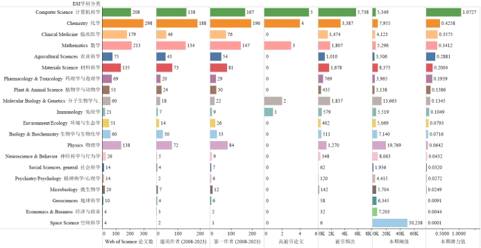 本期永利官网ESI学科分类数据来看,发文量最多的学科为Chemistry化学298篇,引用量最高的学科为Computer Science 计算机科学5738,潜力值最高为1.0727。由于潜力值比实际略有偏高,尽管本期Computer Science 计算机科学潜力值大于1,该学科本期仍尚未进入ESI学科前1%。