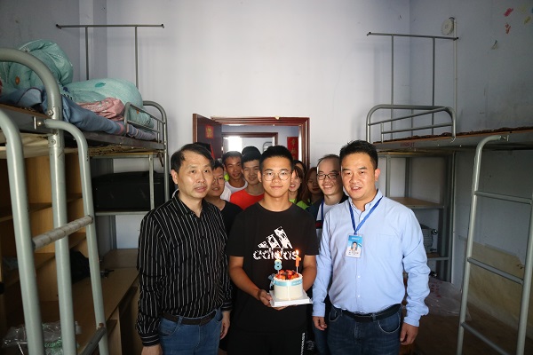 赖申昊老师提前了解到512宿舍的梁贤耀今天是十八岁的生日,专门为他准备了生日蛋糕,还约来对门寝室几位同学一起为他唱起了生日歌。来自河南、黑龙江等各省市的新同学仿佛早已相识,其乐融融。梁贤耀深受感动,对老师和同学们们表示感谢。在交谈中,同学们纷纷表示校园环境优美、学长学姐亲切热情,对即将开启的大学新生活充满期待。